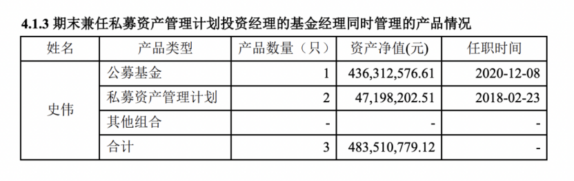 因工作调整,史伟去年2月6日卸任副总经理一职,继续担任公司专户投资一部总经理。截至2023年年末,史伟旗下1只公募基金,资产规模为4.36亿元;另外在管的2只私募资产管理计划,总共资产净值为4719.82万元。